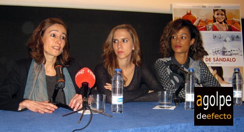 Rueda de prensa: Anna Soler-Pont es coautora de la novela homónima en que se basa la película y además productora y guionista de la misma. Al principio hizo un guión para la adaptación completa de la obra pero eso exigía demasiado presupuesto para rodar en tantas ciudades distintas. Así que finalmente adaptó una de las tramas, la que narra la historia de dos hermanas separadas siendo niñas, una en la India y la otra en Barcelona. Tras siete años de esfuerzo por fin se estrena Rastros de sándalo con otra particularidad: en ella se ha dado prioridad a las mujeres a la hora de formar el equipo, ya que hay muy pocas en el mundo liderando producciones cinematográficas. De este modo se pretende dar un toque de atención a la industria y conseguir además un enfoque netamente femenino de la historia. El tema central es la universalidad de los sentimientos. Éstos no tienen nacionalidad ni raza. Es una película que no deja indiferente, en Holanda despertó carcajadas, en otros lugares emocionó al público, ese es el poder del cine: la capacidad que tiene para conmover de una forma u otra.