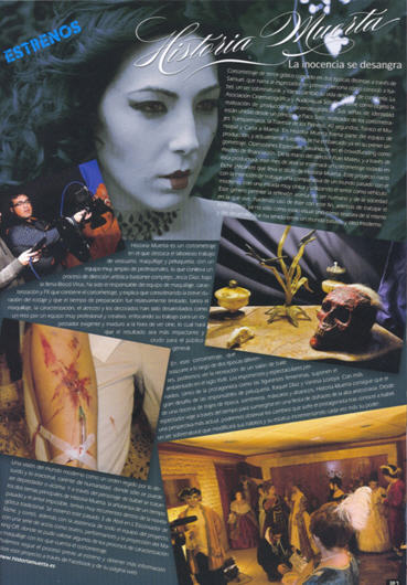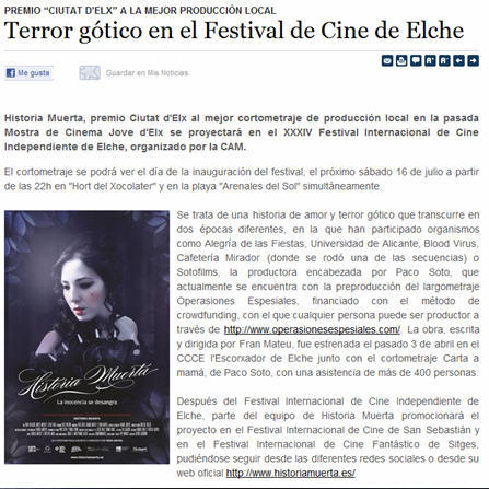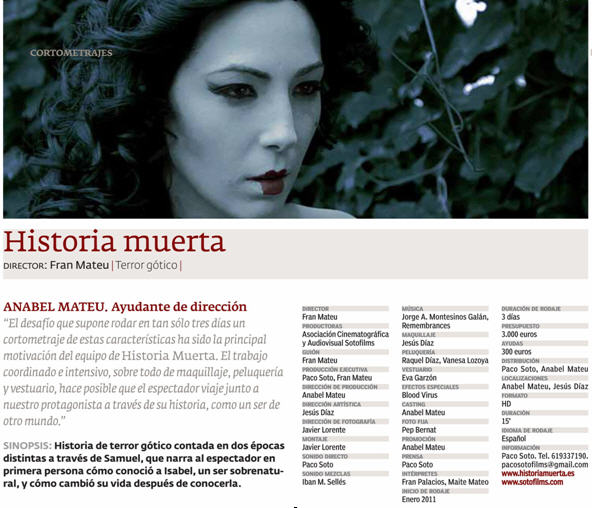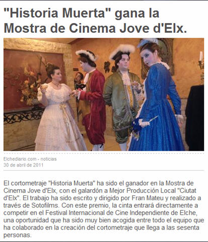 Os presentamos Historia Muerta, un cortometraje de terror gótico contado en dos épocas distintas a través de Samuel, que narra al espectador en primera persona cómo conoció a Isabel, un ser sobrenatural, y cómo cambió su vida después de conocerla. Estrenado el pasado 3 de abril en CCCE L'Escorxador de Elche y galardonado con el premio "Ciudad de Elche" a la Mejor Producción Local, demuestra como las producciones complejas, con medios limitados pueden llegar a tener grandes resultados. Rodado en tan sólo tres días y con un intenso trabajo de dirección, coordinación, maquillaje, vestuario, etc. Además Historia Muerta competirá en la Sección "Premio Objetivo" en la XV Muestra en Toledo de Cine Independiente y Fantástico 2011, que tendrá lugar del 24/11/2011 al 01/12/2011.