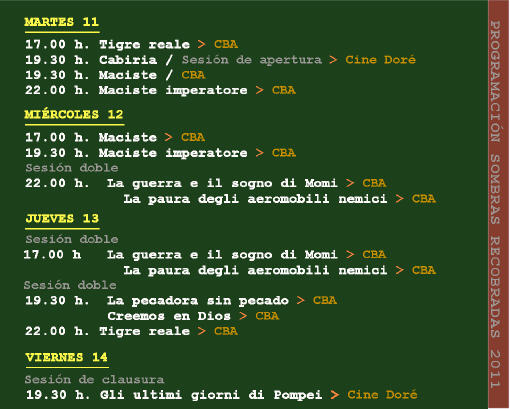 SOMBRAS RECOBRADAS (promo) from Franco Lorenzana on Vimeo. Para la clausura el día 14 del mismo mes, se ha escogido el péplum coetáneo Gil ultimi giorni di Pompei (1913), de Mario Caserini y Eleuterio Rodolfi con acompañamiento a la guitarra de Luis Felipe Gutiérrez. Tanto la inauguración como la clausura serán en la Filmoteca Española (Cine Doré), las demás sesiones de la muestra se celebran en el Círculo de Bellas Artes. Programación: