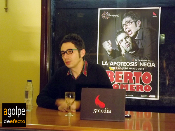 El espectáculo de “Apocalipsis necia” empezó hace años y se ha ido adaptando y manteniendo, algunos de sus textos son intemporales, pero en general se ha ido ajustando, quitando, etc., es como la carcasa de un coche, hemos ido cambiando el motor y las piezas pero el coche es el mismo. El espectáculo es de monólogos que tratan de los grandes temas de la humanidad, sexo o la ausencia de él, el amor o la ausencia de él, la necesidad de trabajar y salpimentado con canciones. La compañía de El Cansancio es algo que siempre ha permanecido, aunque temporalmente haya estado aparcado por la gira con Terrat Pack o por sus incursiones en televisión, pero siempre vuelve a los inicios. “Como artista estoy en medio ni muy mal ni muy bien, eso me da una seguridad desde la mediocridad que me hace parecer muy competente”, la canción es un elemento humorístico más del espectáculo. En definitiva, una hora y media de humor y risas, según Berto “un espectáculo con el que nos sentimos muy cómodos”. Tanto los textos y el desarrollo escénico son originales de Berto, “por el método ensayo-error”.