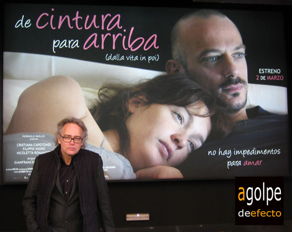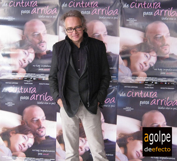 Gianfrancesco Lazotti define “De cintura para arriba” como la historia de una pareja aparentemente sin salida que consigue, a pesar de todo, reconquistar su futuro. La película se basa en una historia real, la de Katia, una chica en silla de ruedas que se enamora de Danilo, un convicto que cumple una condena de treinta años por asesinato. La primera escena describe cómo Danilo goza de un permiso especial y se le permite salir por un día para disfrutar de una breve luna de miel con su nueva esposa. En Italia va completamente contra la ley que a un preso de este tipo se le permita salir pero, como al mismo tiempo es un derecho contraído por su matrimonio, se le permite. Hace diez años, Lazotti rodaba unos exteriores en Roma con actores muy famosos en su país y muchos curiosos se acercaban a observar. Entre ellos estaba una chica que le llamaba insistentemente desde una moto. Esta chica era Katia y de allí surgió una amistad. El caso es que cada vez que Katia le contaba su historia la versión cambiaba un poco con lo que al final no le ha quedado demasiado claro lo que es real y lo que no. Así finalmente Lazotti fue dando forma a un guión con elementos reales y de ficción. A pesar de los problemas que pesan sobre los protagonistas, el director no ha querido hacer un acercamiento social ya que no está interesado en ese tipo de cine. Los personajes, ya sean buenos o malos, tienen de por sí algo que contar. De Danilo podemos admirar su valor y su determinación, de Katia su carácter fuerte y decidido. Esos valores son los que realmente cuentan. También era importante dejar claro desde un principio que Danilo es un asesino confeso y que tanto él como Katia rechazan la compasión, no quieren que nadie les tenga lástima, es algo que aborrecen. Los elementos verídicos de la película son su relación, la luna de miel, y por supuesto las cartas que ella le escribía en nombre de su amiga (en plan Cyrano de Bergerac) y de las cuales nació el amor. El resto del argumento es inventado para hacer una película amena y esperanzadora.