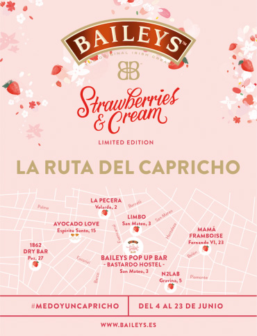 Por ello, Baileys regresa con LA RUTA DEL CAPRICHO, un recorrido lúdico gastronómico donde las variedades de Baileys son las protagonistas. Un itinerario en el que participan diferentes locales de Madrid y donde se podrán degustar tanto los clásicos de Baileys como la nueva variedad Baileys Strawberries & Cream (S&C) y postres exclusivos elaborados para esta ocasión, utilizando esta refrescante bebida.