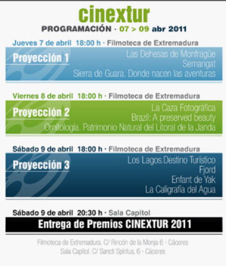 El I Certamen Internacional de Cine de Turismo de Naturaleza , CINEXTUR, que se celebra por primera vez en el marco de dicho festival, pretende servir de escenario para la promoción de todos aquellos elementos naturales susceptibles de convertirse en recursos turísticos y en escenario de actividades de tiempo libre y de disfrute de la naturaleza. 1. La Primera Edición del ” CINEXTUR” tendrá lugar, en Cáceres, España, del 7 al 9 de abril de 2011. 2. Los objetivos que persigue la Consejería de Cultura y Turismo con la celebración de este certamen son: * Sensibilizar al espectador sobre la diversidad y el valor del medio natural, que puede convertirse en el elemento principal de su actividad vacacional y de ocio. * Potenciar la producción de obras audiovisuales basadas en la naturaleza. * Poner en valor la diversidad y el paisaje natural extremeño, que se han convertido en el principal recurso turístico de nuestra región y es la base de nuestro desarrollo sostenible. Tema: La temática se corresponde con obras audiovisuales que promocionan la riqueza de un espacio o un territorio y cómo esta cualidad puede ser conocida, apreciada y valorada por el visitante. No se trata de un Certamen de producciones de protección medioambiental sino de producciones que ponen en valor los recursos naturales, el paisaje y la riqueza ambiental, como recurso turístico y de desarrollo de un territorio, basado en los criterios de desarrollo sostenible. Como en todas las producciones audiovisuales de promoción turística, se valorará la capacidad creativa, artística y plástica a la hora de interpretar visualmente los espacios o territorios, la originalidad en la elección de los temas tratados, la innovación en el montaje y producción y la capacidad de atracción del film. 3. Las obras presentadas tendrán que cumplir los requisitos propuestos en las bases. Programación: