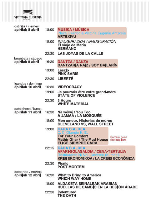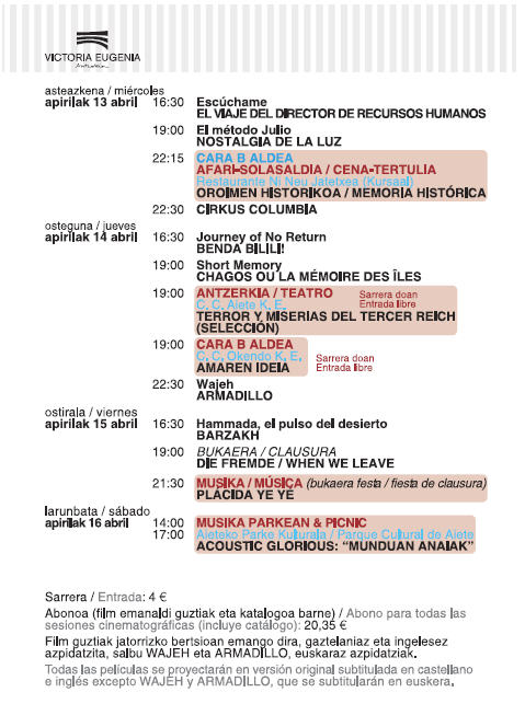 Una vez más, mi más sincero agradecimiento a la Red Internacional Human Rights Film Network, UNICEF, ACNUR, CEAR, Amnistía Internacional, Coordinadora de ONGD de Euskadi, SOS Racismo, Gehitu, Asociación Internacional de Ciudades por la Paz, Cátedra UNESCO de Derechos Humanos de la UNAM de México, el Festival de Cine Español de Nantes y el Festival de la Academia Mexicana de Derechos Humanos por el respaldo que nos ofrecen. Y una mención especial a la Agencia Española de Cooperación Internacional al Desarrollo (AECID) y a la Comisión Europea por su apoyo económico en estos tiempos de crisis. Bienvenidos/as a San Sebastián, bienvenidos/as al cine de valores humanos. ODÓN ELORZA GONZÁLEZ. Alcalde de San Sebastián. Programación: