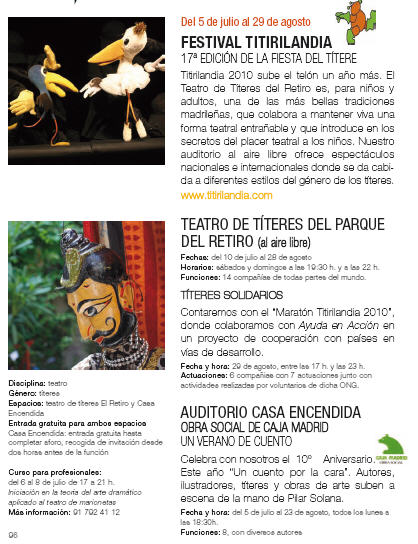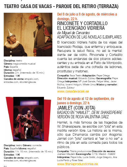 6 y 7 de agosto - Gala Roland Petit Veranos en la Calle El festival se ha caracterizado en los últimos años por su voluntad de tomar el espacio público para convertirlo en un escenario más. La ciudad convertida en tapiz de danza, en sala de conciertos, en escenario. En definitiva, una ciudad al servicio de las artes escénicas, donde los espectáculos saldrán al encuentro de los ciudadanos, que podrán disfrutarlos de manera gratuita. Uno de los pilares de la programación de calle vuelve a ser el ciclo Música para la puesta de sol, que acogerá diversos conciertos en la plaza de Oriente. Por su parte, la plaza de Sánchez Bustillo ofrecerá Danzacalles, el ciclo de danza contemporánea que organiza la Sala Cuarta Pared, en el que participarán coreógrafos y compañías como Teresa Nieto, Mónica Runda y Carmen Werner, Camile C. Hanson, Manuel Rodríguez o Jordi L. Vidal. Por su parte, el Templo de Debod acogerá un año más un ciclo de músicas del mundo. Además, y como novedad dentro de Veranos en la Calle, el festival ha creado el Espacio Fringe, en el auditorio del Parque Tierno Galván, con el que abre su programación a conjuntos más desconocidos, de estilos musicales muy variados. Por último, y también como novedad, la terraza de Casa de Vacas acogerá un escenario dedicado al teatro, donde la compañía Ítaca Teatro ofrecerá sus adaptaciones de El licenciado vidriera, y Rinconete y Cortadillo, de Cervantes, del 8 de julio al 8 de agosto, y la compañía Titania ofrecerá Jamlet (con J), una versión del clásico de Shakespeare, a partir del 12 de agosto. Completarán la oferta al aire libre dos clásicos en la programación del festival: el encuentro de títeres del Retiro, Titirilandia 2010, y el ciclo de cine al aire libre en el Parque de la Bombilla, Fescinal 2010.