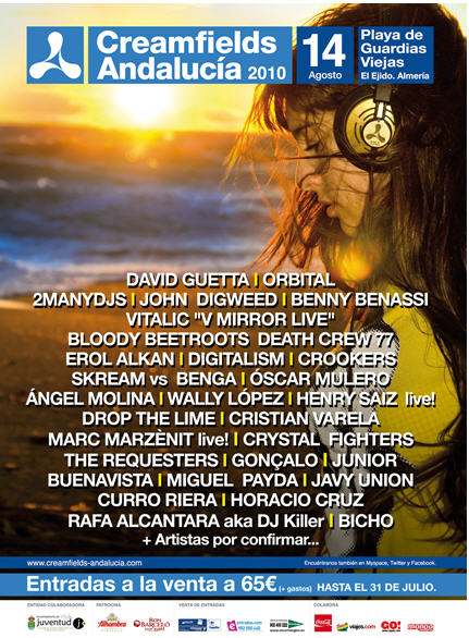VITALIC "V Mirror live", BENNY BENASSI, BLOODY BEETROOTS DEATH CREW 77, CROOKERS, DIGITALISM destacan, por ahora, en un cartel con las primeras confirmaciones que también incluye a otros grandes revienta-pistas de la escena internacional como DROP THE LIME, WALLY LOPEZ, CRISTIAN VARELA, OSCAR MULERO y MARC MARZÈNIT. El Festival CREAMFIELDS ANDALUCIA vuelve a apostar por la máxima calidad y la mayor variedad para su edición de 2010. Una edición en la que crece el cartel, el número y las dimensiones de los escenarios y los artistas llamados a convertir el espacio a pie de playa en un hervidero de buenas sensaciones, mezclas increíbles y excelentes ritmos que hará las delicias de todo el que se acerque a disfrutar del festival veraniego por excelencia del Sur .La fecha elegida para la celebración de CREAMFIELDS ANDALUCIA 2010 es el sábado 14 de agosto. Desde las 5 de la tarde y hasta las primeras luces del alba del día siguiente, la playa de Guardias Viejas en el Ejido, Almería, se convertirá de nuevo en el epicentro de la mejor música electrónica del planeta.