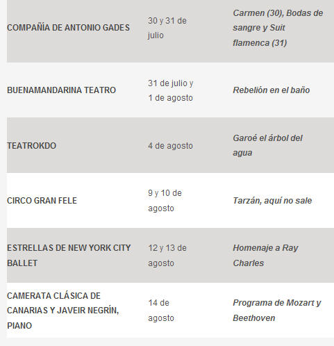 A finales de julio, Dagoll Dagom presenta Noche de San Juan, una “revista galáctica” que la reconocida compañía catalana repone en escena, después de 28 años. A continuación, la Orquesta Sinfónica de Las Palmas y los Coros de la OFGC presenta el primer concierto producido por el propio festival, bajo la dirección de Luis García Santana, en el que coincidirán tres magníficas voces. La puesta en escena, bajo la dirección de Tony Suárez, contará con la proyección de imágenes grabadas especialmente para la pieza, Carmina Burana, que contribuirán a potenciar los sentidos tal y como pretendía su autor, Carl Orff. La danza comienza con un completo cartel en este festival con la compañía italiana TPO y su fascinante e innovador espectáculo de grafismo digital, teatro visual y danza contemporánea, titulado Barroco. Continúa con la presentación de la compañía Corella Ballet Castilla y León que propone un programa en el que ofrece al espectador la posibilidad de contemplar cómo ha evoluciona la danza, y sigue con la Compañía de Antonio Gades que ha recuperado para los escenarios sus extraordinarios espectáculos Carmen, Bodas de Sangre y Suite flamenca.
