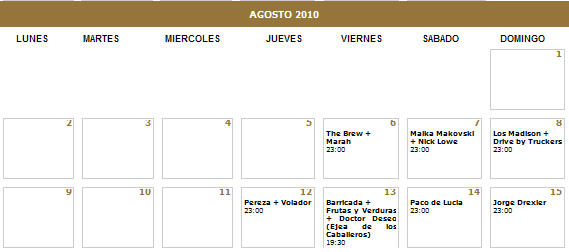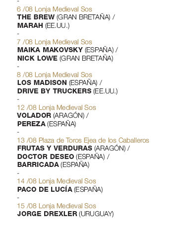 - BRETT ANDERSON - THE RAVEONETTES - LOS PLANETAS - THE ETTES - THE SOUNDS - LOQUILLO - LOS PUNSETES - LOVE OF LESBIAN - SHUARMA - SIDONIE - SOUL TELLERS - LORI MEYERS - Delorean - NUDOZURDO - ARIZONA BABY - FERNANDO ALFARO - MAGA - L.A. - ZENTTRIC - THE RIGHT ONS - JOAQUIN PASCUAL - LAYABOUTS - PULL - ESTEREOTYPO - MAIKEL DE LA RIVA - DHERA DUN y BALUJI SHRIVASTAV - SUPERSUBMARINA - VINILA VON BISMARK & THE LUCKY DADOS - Vinodelfin - CAMPINGAS - CRONOMETROBUDU - HOLA A TODO EL MUNDO - IDEALIPSTICKS - NIXON - THE THREE GENERATIONS - INKEYS - KLAUS & KINSKI - MY FRIEND FINGER - CHARADES - ULTRAZORRAS - TACHENKOHOLA HOLA HERMANITA - NAPOLEON SOLO - ESCUELA GURUS - STANDSTILL |