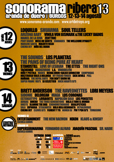 SONORAMA es una semana de cine y música con filosofía independiente que celebra este año su XI edición. Ha sido catalogado como el festival de música pop rock más importante de Castilla-León y uno de los más importantes a escala nacional. La Asociación Cultural Art de Troya es la encargada de organizar y producir SONORAMA. Un grupo de jóvenes que sin ánimo de lucro intenta dar a conocer las nuevas tendencias culturales en todos los ámbitos. Y sobre todo "conquistar el sitio en el que vivimos con nuestra imaginación." SONORAMA se celebra en Aranda de Duero, una ciudad burgalesa de 30.000 habitantes con un gran atractivo turístico y en pleno desarrollo cultural y económico, con unas comunicaciones inmejorables. CARTEL: |