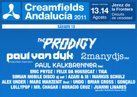Creamfields Andalucía 2011 a Jerez y confirma a The Prodigy. El Festival Creamfields Andalucía 2011 se traslada al Circuito de Velocidad de Jerez de la Frontera y amplía a dos días su oferta musical de artistas de primer nivel internacional. La banda inglesa The Prodigy es el primer headliner confirmado para esta nueva edición en la que se ofrece acampada y lanzaderas gratuitas para los abonados que unirán el recinto con la playa gaditana.