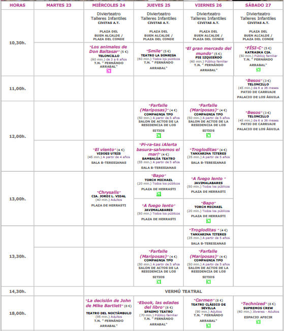 Día 25 TEATRO LA SONRISA “Smile” Día 26 PIE IZQUIERDO “El gran mercado del mundo” Día 27 KATRASKA COMPAÑÍA “Fisi-c”