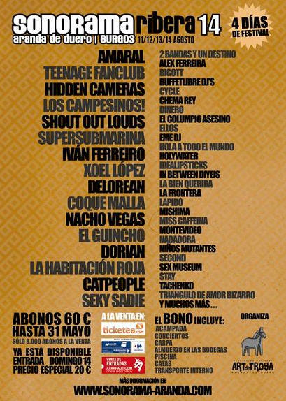 XIV edición del Festival Sonorama, se llevará a cabo en la ciudad de Aranda de Duero (Provincia de Burgos) los dias 11, 12, 13 y 14 de agosto. SONORAMA es una semana de cine y música con filosofía independiente que celebra este año su XI edición. Ha sido catalogado como el festival de música pop rock más importante de Castilla-León y uno de los más importantes a escala nacional. Cartel Sonorama 2011