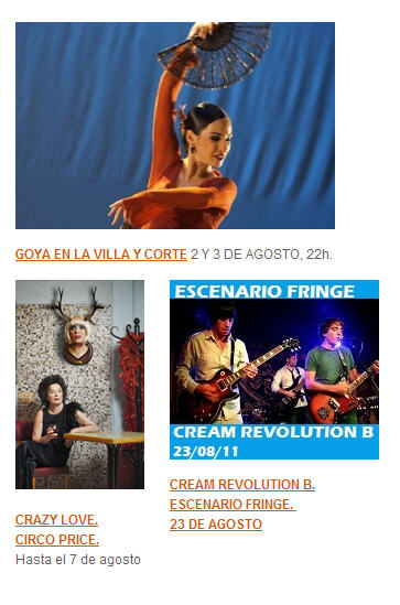 · Espacio Fringe (Parque Pinar del Rey – Auditorio Pilar García Peña) 22 de agosto CREAM REVOLUTION B 23 de agosto JVERA QUARTET 24 de agosto WATCH TV AND THE PRIMETIMES 25 de agosto LUIS BREA 26 de agosto GRUPO GANADOR DEL CONCURSO DE LA JUNTA DE DISTRITO 27 de agosto ROSVITA