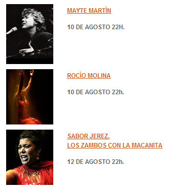 · Jardines de Sabatini: 2 – 3 DE AGOSTO GOYA EN LA VILLA Y CORTE CÍA. DE DANZA DE CARMEN CANTERO 4 – 9 DE AGOSTO COSACOS 10 DE AGOSTO MAYTE MARTÍN 11 DE AGOSTO ROCÍO MOLINA 12 DE AGOSTO LOS ZAMBOS CON LA MACANITA 13 DE AGOSTO CAÑIZARES 14 DE AGOSTO ARGENTINA 15 DE AGOSTO THE AMERICAN SPIRITUAL ENSEMBLE 18 – 28 DE AGOSTO (LUNES 22 DESCANSO) ÓPERA EL BARBERO DE SEVILLA 28 DE AGOSTO IL COMBATTIMENTO DI TANCREDI E CLORINDA