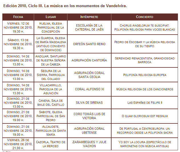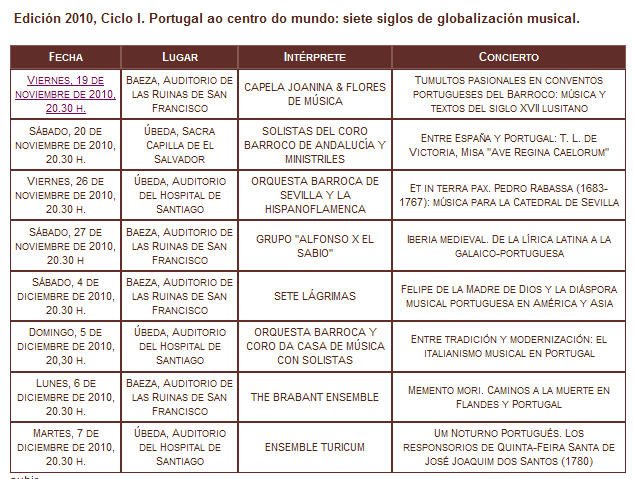 Más allá de anacronismos, y superando también los muros ideológicos levantados por las historiografías nacionales esencialistas -que han limitado nuestra comprensión del fenómeno al reducirlo, en caso portugués, a una invasión ilegítima e inaceptable para la soberanía nacional y, en el español, a una encendida exaltación de unidad y expansión imperialista castellana y católica-, aquí se propone un proceso mutuo de comprensión en el que lo ibérico, con sus luces y sus sombras, aparece como única forma de entender este teatro de interacciones planetarias que permitió la proyección mundial de las prácticas musicales no sólo de Portugal y España, sino también de toda Europa. Es también un recuerdo para la historiografía clásica europea, que con frecuencia obvia esta realidad gigantesca de las Américas, las Asias y las Áfricas ibéricas o reduce su presencia al exotismo, cuando en realidad estamos ante áreas de conforman, utilizando un término moderno tomado de Serge Gruzinki, "zonas interactivas" en las que proliferaron relaciones económicas, raciales, culturales y musicales de gran riqueza y complejidad sin las cuales no sería posible entender la propia historia europea. De esta perspectiva transnacional que aspira a conectar espacios y establecer vínculos hoy perdidos, el Festival 2010 se dedica a Portugal y a su papel revolucionario en los procesos de globalización y occidentalización del que son resultado las prácticas musicales de grandes ciudades mestizas como Salvador de Bahía, Buenos Aires, México, Lima, Manila, Amberes, Goa, Macao, Cabo Verde, Luanda o, en la propia península ibérica, Lisboa o Sevilla. Desde la música en los conventos portugueses al repertorio organístico ibérico y sus conexiones con Italia y Flandes; desde la polifonía litúrgica escuchada en Río de Janeiro hasta los cantos tradicionales de Timor; desde el repertorio de cantigas en galaico-portugués del siglo XIII -importante precedente globalizador- hasta los villancicos barrocos portugueses conservados en Guatemala, todo ello entremezclado con diversos aniversarios de compositores ibéricos de circulación internacional como Manuel Cardoso o Antonio de Cabezón. El Festival 2010 quiere reivindicar la importancia de Portugal en la historia musical desde la Edad Media y las múltiples interconexiones musicales que este territorio, situado no centro do mundo, fue capaz de establecer con el resto del globo. Veintisiete conciertos, un curso de musicología y un ciclo de conferencias reunirán en Úbeda y Baeza a músicos, investigadores y estudiosos procedentes de Portugal, Brasil, Guatemala, Suiza, Bélgica, Italia e Inglaterra. Buen ejemplo de globalización, fenómeno que como hemos visto no es tan moderno. En última instancia, el Festival aspira a fomentar, desde el respeto y la admiración a la cultura portuguesa, los intercambios musicales y musicológicos ibéricos y a superar la ignorancia recíproca que durante décadas se promovió en ambos países por motivos más imaginarios que históricamente fundados. Así evitaríamos caer en el peligro de perdernos, "como tantas veces sucedió en el pasado -según José Saramago, Premio Nobel de Literatura desaparecido este mismo 2010-, en los embelecos de una retórica vacía y oficialista, que sería la responsable de los nuevos malentendidos que llegaran a sumarse y a agravar los antiguos". Ojalá la música antigua contribuya en alguna medida a avanzar en este reencuentro. Javier Marín López, Director del Festival Programación: