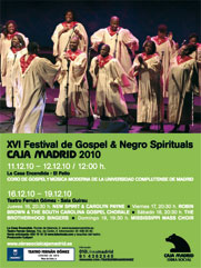 Festival Gospel and Negro Spirituals Caja Madrid 2010 Del 11 al 19 de diciembre de 2010 se celebra el XVI Festival Gospel & Negro Spiritual Caja Madrid 2010 con dos escenarios para sus actuaciones: La Casa encendida con entradas a un euro y el Teatro Fernán Gómez con precios de 25 euros cada concierto. Programa La Casa Encendida Programa Teatro Fernán Gómez