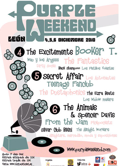 Serán 18 grupos, con sus respectivos conciertos y sus correspondientes allnighter, en cinco escenarios. Con nombres insustituibles como Booker T, Teenage Fanclub, Animals and Spencer Davies, Secret Affair o From The Jam… En definitiva: más cabezas de cartel que jornadas… Además de destacar la colaboración de diferentes sectores socioeconómicos de la ciudad, así como las marcas patrocinadoras, una de las principales novedades será el cambio de escenario principal, que se trasladará al pabellón del CHF en lugar del Hispánico, lugar tradicional de los conciertos de la noche. Mejorar la confortabilidad y la calidad del sonido, la comodidad del público y de los músicos es la intención de tal cambio a un escenario que se llamará Escenario Estrella Galicia Purple Weekend. Junto a este, además de los conciertos en la Universidad, se cuenta con los otros escenarios, como son el Escenario Pepsi León Gótico, en la plaza de Santo Martino, el escenario Gran Café, y el Espacio Vías.