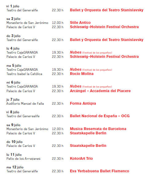 La programación de este año alberga múltiples citas y referencias a otros acontecimientos o aniversarios, como el estreno en España y en coproducción de la ópera Ainadamar con motivo del 75 aniversario de la muerte de Federico García Lorca, la recuperación con carácter de estreno de la excelente ópera dieciochesca Solimano, los estrenos absolutos de Negro-Goya a cargo del Ballet Nacional de España y de Federico según Lorca de Eva Yerbabuena Ballet Flamenco, el estreno de cinco obras para piano incluidos en los recitales dedicados a Franz Liszt como parte del programa internacional MusMA (Music Masters on Air), el ciclo de actividades en memoria del genial polifonista Tomás Luis de Victoria, la presencia del sensacional Ballet y Orquesta del Teatro Stanislavsky de Moscú en el marco del Año Dual España-Rusia 2011, la emocionante presencia de Víctor Ullate en el Festival, el estreno del espectáculo mestizaje del grupo Accademia del Piacere y el cantaor Arcángel, las presencias estelares de Estrella Morente y Rocío Molina con el flamenco como Patrimonio Inmaterial de la Humanidad, la inmersión en el universo de Vivaldi a cargo del sorprendente conjunto Forma Antiqva. La Orquesta Ciudad de Granada destacará por su presencia en el teatro del Generalife mientras en el Palacio de Carlos V ocupan escenario la Orquesta de la Comunitat Valenciana y Cor de la Generalitat Valenciana con Zubin Mehta, la Schleswig-Holstein Festival Choir&Orchestra y la Staatskapelle de Berlín con Daniel Barenboim, quien concluye el ciclo dedicado a la integral de las sinfonías de A. Bruckner, un hito histórico del sinfonismo en Andalucía y España. El KotorArt Trío, la 42 edición de los Cursos Internacionales Manuel de Falla (interpretación e investigación musical y vocal históricas, fotografía, composición e interpretación contemporáneas, clases magistrales de danza, creadores y escena social, análisis musical), la extensión del Festival, Fex, o los espectáculos dedicados a los más pequeños y a los jóvenes acrecentarán el número de actividades preservando siempre la calidad en la diversidad de los programas y actuaciones. Y además, destacamos el 60 cumpleaños del hermano Festival Internacional de Santander con quien compartimos parte de la programación.