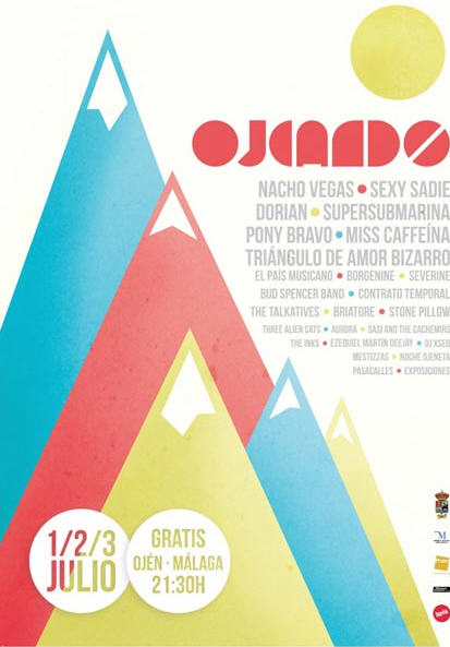 OJEANDO FESTIVAL 2011 es uno de eventos referentes en la provincia de Málaga, un festival de música pop-rock independiente con personalidad propia que se celebra los días 1, 2 y 3 de julio de 2011 en el municipio de Ojén. Tres días, tres escenarios, todos dentro del casco urbano de la villa, sesiones de dj y más de 30 actuaciones, entre las que destacamos las de Nacho Vegas, Sexy Sadie, Dorian, Supersubmarina, Pony Bravo, Triángulo de Amor Bizarro y Miss Caffeina. Un festival gratuito que este año, como novedad, incorpora a su programación una tradición puramente ojeneta: los “Churros Mojaos” en agua con sal que además se podrán tomar con chocolate, con café, con leche condensada, etc… Tres escenarios, 30 actuaciones, tres días, gratis /