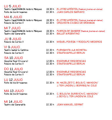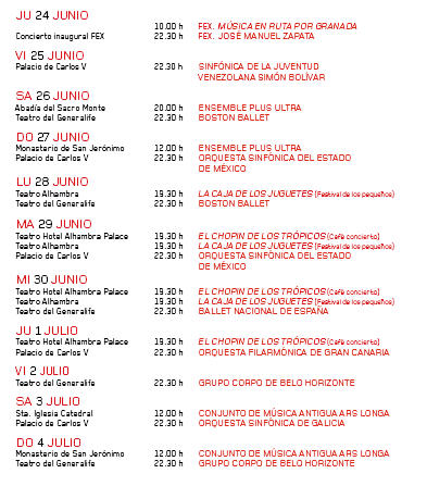 El Festival Internacional de Música y Danza de Granada es una de las citas más atractivas a comienzos de verano en España. Tiene su origen en los conciertos sinfónicos que desde 1883 se celebraban en el Palacio de Carlos V y en el Concurso de Cante Jondo, convocado en la Plaza de los Aljibes de la Alhambra en 1922, con la asistencia de Federico García Lorca, Manuel de Falla, Ramón Gómez de la Serna, Santiago Rusiñol y otros intelectuales y artistas de la época. El Festival constituye una verdadera eclosión de actividades artísticas, con gran repercusión nacional e internacional, celebradas en los rincones más emblemáticos de la ciudad. Los conciertos de grandes orquestas sinfónicas en el Palacio de Carlos V, la danza y el ballet en el teatro al aire libre de los Jardines del Generalife, los recitales en el Patio de los Arrayanes de la Alhambra, conciertos matinales en iglesias y monumentos de Granada, junto a las músicas del mundo en los barrios típicos del Albaicín y el Sacromonte, congregan cada año a más de 54.000 personas, que acuden atraídas por la magia del espectáculo en espacios únicos. Todo ello, unido al mejor patrimonio de Granada, sus monumentos, sus jardines y su historia, sumergen a la ciudad y al visitante durante los primeros días del verano en una atmósfera de fiesta que crece año tras año.