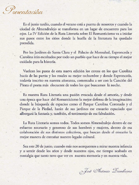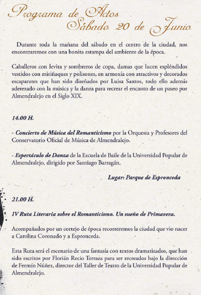 La "Ruta Literaria sobre el Romanticismo" se enmarca dentro del Programa de Actividades de los Encuentros sobre el Romanticismo que se celebran en Almendralejo. Como ya es tradicional, arranca la V edición de la conocida Ruta Literaria Del Romanticismo. Y como cada año tendrá lugar un fin de semana de Junio en la localidad pacense de Almendralejo. Con este evento la ciudad se engalana para "viajar" al siglo XIX y rendir homenaje a José de Espronceda y Carolina Coronado, dos ilustres ciudadanos de esta localidad y representantes del romanticismo literario español. Essta población se viste con los mejores trajes de la época, y en cada rincón de la ciudad se escuchan románticos versos y se asiste a representaciones teatrales. Durante toda la jornada se podrá disfrutar de lo mejor de la gastronomía de la zona, participando en 'La Ruta de la Tapa' o degustando, en sus restaurantes y terrazas, platos tan tradicionales como La caldereta, El cochinillo a la extremeña, El arroz con liebre, un buen plato de jamón ibérico o unas sabrosas aceitunas Manzanilla o Verdiales. Todo esto, mientras se escuchan versos románticos y se asiste a representaciones teatrales en cada rincón de la ciudad. Almendralejo es el lugar de nacimiento de figuras relevantes como José de Espronceda y Carolina Coronado y es por ello, que desde las Concejalías de Cultura y Mujer del Ayuntamiento de Almendralejo, se apuesta por la realización de estos encuentros con la finalidad de difundir el legado cultural de la ciudad a todas aquellas personas interesadas en aspectos literarios, culturales, sociales y de usos y costumbres tradicionales de la época romántica.