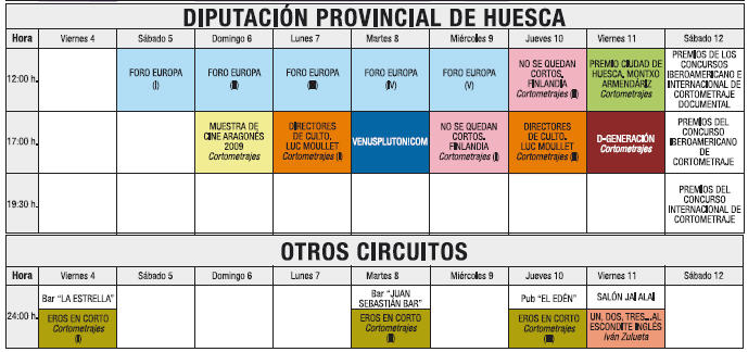 La mesa del Comité de dirección del Festival es redonda para que en las reuniones circulen las ideas, lo que permite conseguir la mejor programación para todos los públicos. Conviene no olvidar que en esta fiesta de la cultura cinematográfica el verdadero protagonista somos tú y yo, pues es con el dinero público con el que se organiza. Y no ha sido fácil en este año de crisis económica, que no de ideas y proyectos, y así donde había un 0 hemos conseguido un 8. ¿Cómo? Con la entrada de 3 nuevos miembros en la organización y recogiendo el fruto de 37 años de colaborar con otros y, sumando-sumando, ya es una realidad la 38 Edición. Gracias al calor de la tópicamente fría Finlandia y su cuarentón festival de Tampere no nos quedaremos cortos. Gracias a distintos bares emblemáticos de la ciudad, esos lugares gratos para conversar, nos salimos de las salas habituales para ver cine de noche y para mayores con reparos, que se decía antes: Eros en corto. Gracias a las ilusiones y el talento de cineastas de 56 países, Huesca será la embajada del mundo del corto, también del aragonés, donde tres festivales cumplen 15 años; tendremos encuentros y talleres, y sin olvidarnos del largometraje europeo, queremos que el cine español tenga su sitio con dos exposiciones (la del director artístico Benjamín Fernández, y la del hombre de cine y pilar que fue de este Festival, Alberto Sánchez), más diferentes premios, reconocimientos y descubrimientos para la gran mayoría: Ángela Molina, Montxo Armendáriz, Eugenio Monesma y Luc Moullet, ¡nuestra gratitud por acompañarnos! En este mundo, real y del cine, tan grande e imperfecto aunque redondo, abriremos una vez más la ventana clásica para mirar atrás, y a su lado, otra, la del panorama de lo último y casi extraterrestre: VENUSPLUTON!COM, músicas para ver, imágenes para oír, y D-GENERACION, experiencias vanguardistas de la no ficción española. Gracias a Alberto Sánchez que se fue como estuvo: