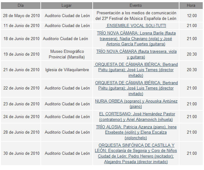 La relación entre la música y la poesía ha sido y es una de las más antiguas y fructíferas colaboraciones que se producen entre las diferentes manifestaciones artísticas, y durante la vigésimo tercera edición del Festival tendremos varios ejemplos de ello. El dúo de contratenor y vihuela El Cortesano nos brindará música renacentista de Alonso Mudarra; la soprano Nuria Orbea, acompañada al piano por Anouska Antúnez, ofrecerá un recital de canción española y zarzuela; y tanto el mencionado Ensemble Vocal Soli-Tutti como la Escolanía de Segovia y el Coro de Niños Ciudad de León, nos acercarán la música contemporánea. Además de Lorca, otros poetas como Rafael Alberti, Luis Amado Carballo, Juan Ramón Jiménez, Luis de Góngora o Antonio Martín-Carrillo, pondrán letra a músicas de ayer y de hoy. Entre los estrenos destaca la “Cantata para la Fundación de un Reino” para recitador, coro mixto y orquesta sinfónica, del leonés José Mª García Laborda. La obra, conmemorativa del 1.100 aniversario del Reino de León, incluida también en el programa “Raíces 910-2010”, verá la luz en el concierto de clausura a cargo de la Orquesta Sinfónica de Castilla y León. También se estrenarán obras de la madrileña con raíces leonesas Consuelo Díez, del hispano-cubano Flores Chaviano y del catalán Leonardo Balada. Uno de los objetivos del Festival es el de difundir la música de los compositores leoneses. Así, de García Laborda escucharemos “Floreal” para flauta travesera, viola y guitarra, además de la mencionada cantata; de Evaristo Fernández Blanco oiremos por primera vez en el Festival dos canciones: “Mi cuna” y “Lloraba la niña”, así como su “Trío en Do Mayor” para piano, violín y violonchelo interpretado por el Trío Alosia. Además, el Festival convoca este año el V Concurso de Composición “Evaristo Fernández Blanco”, cuyo premio se fallará en 2011; y continuará con la publicación de partituras en edición crítica de la colección dedicada al magnífico pianista y compositor leonés Pedro Blanco. Por otra parte, la Orquesta de Cámara Ibérica, orquesta residente del Festival de la que forman parte varios músicos leoneses, tendrá doble protagonismo en esta edición: a los dos conciertos que ofrecerá en Villaquilambre y en León hay que añadir una importante grabación con obras de Leonardo Balada para el sello discográfico Naxos de distribución internacional. El registro sonoro tendrá lugar en el Auditorio Ciudad de León, otorgando una difusión de un valor incalculable tanto al Auditorio como al Festival y su orquesta. Un año más la música iberoamericana tendrá una presencia muy significativa en el Festival. Cuando se cumplen doscientos años de la independencia de varios países iberoamericanos, una mirada al espejo del tiempo de América y España adquiere nuevos y relevantes perfiles de los que podremos ser testigos en varios conciertos. Al escenario de la Tribuna de Jóvenes Intérpretes subirá en esta edición el Trío Nova Cámara, con un programa en el que combinan música de “los clásicos” Turina o Piazzolla con obras actuales de Chaviano, Enrique Muñoz o Laborda. En estos momentos de crisis económica, el apoyo y