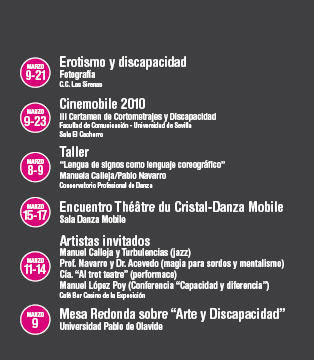 En su cuarta edición, EscenaMobile pretende no sólo consolidar los logros y aprendizajes adquiridos, sino sentar las bases para abrir a medio y largo plazo nuevos caminos en los ámbitos del arte, la discapacidad y la comunicació social. Tres años después de su primera edición, en 2007, la Asociación Compañía DanzaMobile y el Teatro Lope de Vega se unen de nuevo para lanzar el IV Festival Internacional de Arte y Discapacidad EscenaMobile, un proyecto nacido con el objetivo de convertir Sevilla en escaparate del panorama internacional de arte y discapacidad, mostrando espectáculos y compañías de elevado prestigio ausentes, con frecuencia, de los circuitos convencionales. Cada primavera y durante varios días, el trabajo desarrollado a lo largo de meses cristaliza en EscenaMobile, un proyecto integrado en la visión global que Compañía DanzaMobile desarrolla durante todo el año: trabajar con personas con discapacidad a partir del ámbito artístico, para fomentar su desarrollo personal y social e intentar ejercer como lanzadera laboral. Además de este objetivo básico, las sucesivas ediciones han supuesto la evolución del proyecto originario en búsqueda de nuevas perspectivas y desarrollos que amplifiquen la dimensión de EscenaMobile, impulsando nuevos enfoques y metas: