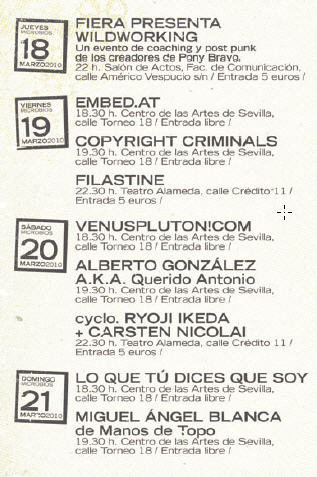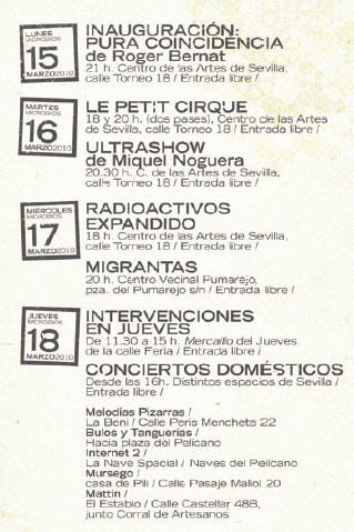 Programa ALT.10 Por las calles de la ciudad Viernes 12 de marzo Sábado 13 de marzo Domingo 14 de marzo Xoves 18 de marzo Venres 19 de marzo Sábado 20 de marzo El viernes día 19 de marzo, aprovechando la visita de diversos directores de otros festivales, haremos un programa especial con tres trabajos de nuestra comunidad. Utilizaremos los espacios habituales para ello y contaremos con la presencia de: Carolina Fernández, creadora audiovisual, bailarina y performer. Alfonso Rivera, profesor de mimo y expresión corporal en la ESAD de Galicia y creador. Uxía P. Vaello e Borja Fernández, artístas multidisciplinares procedentes de distintas artes como danza, circo y teatro. Con este programa se continua el camino comenzado el año anterior con el week end.