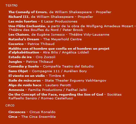 El XXVIII Festival de Otoño en primavera acercará a la Comunidad de Madrid obras de grandes figuras de la escena, como Peter Brook, Romeo Castellucci, Sasha Waltz, Israel Galván, Luc Bondy o Rimas Tuminas; así como creaciones de artistas emergentes y renovadores, entre los que destacan Ciro Zorzoli, Pierre Rigal, Fadhel Jaïby o la Hofesh Shechter Company. El encuentro contará con un cartel plural que reúne piezas contemporáneas para todos los gustos y podrá verse en los Teatros del Canal de la Comunidad de Madrid, en el Teatro de La Abadía, La Casa Encendida, el Teatro Español, las Naves del Español - Matadero Madrid, el Teatro Pradillo, la Sala Cuarta Pared, el Teatro Fernán Gómez y el Real Coliseo de Carlos III de San Lorenzo de El Escorial, entre otros espacios. El festival contará con 31 estrenos -cuatro absolutos, 17 en España y diez en la Comunidad de Madrid- y programará 25 producciones internacionales, procedentes de: Alemania (2), Argentina (3), Australia (1), Bélgica (2), Estados Unidos (3), Francia (5), Italia (1), Países Bajos (1), Reino Unido (3), Rusia (2), Suiza (1) y Túnez (1). De los ocho espectáculos españoles que estarán presentes en el festival, dos son andaluces y seis de compañías sitas en la región madrileña.