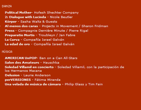Otro de los platos fuertes del festival será la música, con las actuaciones de figuras como Laurie Anderson, con el espectáculo de música y performance Delusion; Soledad Villamil, que presenta sus tangos junto a los Hermanos Macana, y Fátima Miranda, que estrena en Madrid perVERSIONES, un ejercicio vocal y pianístico que aúna jazz, copla, pop, fado y chanson. Como broche, actuará también el estadounidense Philip Glass, uno de los compositores más influyentes de finales del siglo XX, que en esta ocasión colabora con el violinista Tim Fain. Más información.