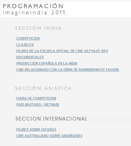 Farah Hadmed (Miembro del jurado del Festival) y asidua al mismo todos los años, comento la importancia del Festival desde el punto de vista de una actriz que ha trabajado de forma asidua en el cine indio. Por último, Abdur Rahim Qazi (Director del Festival), comentó el gran esfuerzo realizado este año por el Festival, no solamente por la crisis actual, sino también, por la calidad de las películas, actores, poetas, etc., se han traído a 15 personas desde la india para esta edición, tal y como se puede ver con todo lujo de detalles en el programa del mismo y la web del Festival. Además existen actividades de compromiso y concienciación como la lectura de poesía en castellano e indio para niños en la Plaza de Lavapies y multitud de actividades infantiles. Este año se cuenta con mayor número de apoyos institucionales, aunque desde aquí animamos a un mayor nivel de compromiso ante esfuerzos como este por potenciar la cultura. Entre los invitados especiales del festival destacan la estrella india Nandita Das, así como María de Medeiros, Ángela Molina, Ananth Mahadevan, Bindiya Khanolkar, Daniela Creutz, Gen Hewett, Karen Zusman o Víctor Banerjee, algunos de ellos se encontrarán presentes en la Gala de Clausura del festival que se realizará el día 30 de este mes. El festival cuenta con tres secciones: India (Competición, Clásicos, Filmes de la Escuela Oficial de cine de Satyajit Ray, Documentales, Producción Española en la India y Cine sobre la obra de Tagore), Asiástica (fuera de competición) y Sección Internacional (Cine sobre gitanos y Cine australiano sobre aborígenes). La Sección India estará representada en Competición por ocho largometrajes de directores de India, Italia, Inglaterra y Alemania. SALAS DONDE SE DESARROLLA EL FESTIVAL
