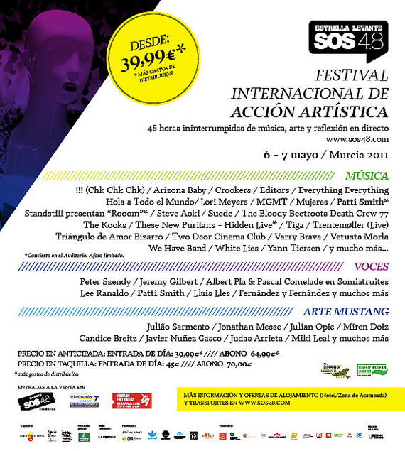 La cuarta edición del Festival Estrella Levante SOS 4.8 abrirá la temporada de festivales de verano, los días 6 y 7 de mayo de 2011. Bajo el lema de la SOStenibilidad, SOS 4.8 son 48h non-stop de Música, Arte contemporáneo y Reflexión.