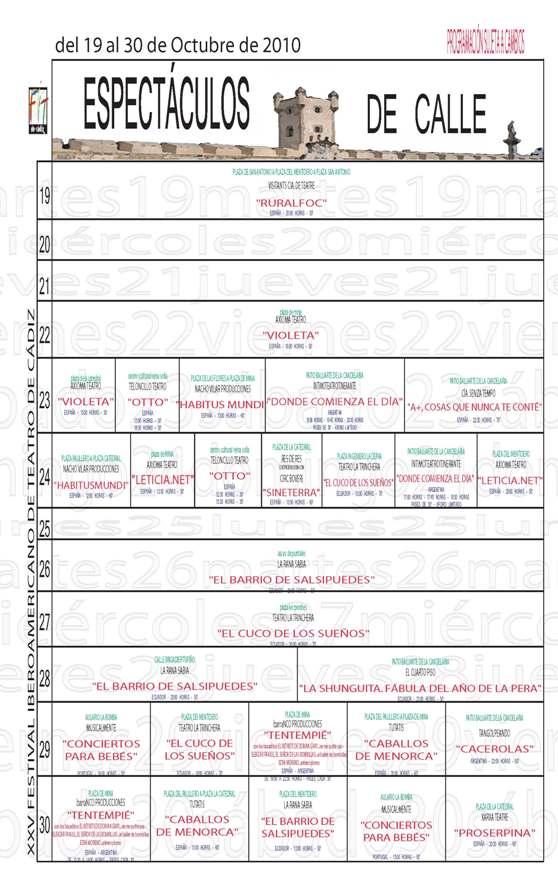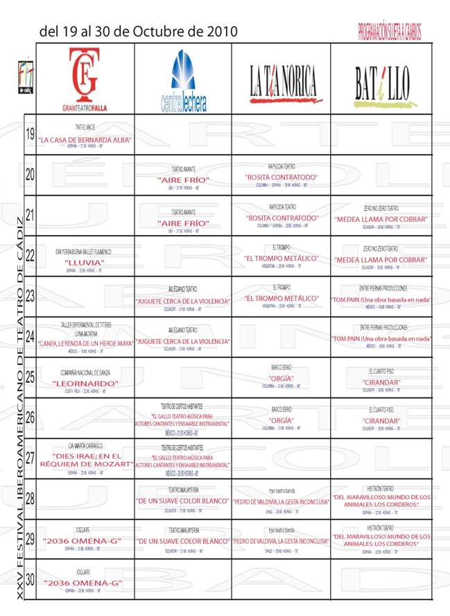 Del 19 al 30 de octubre de 2010 Hoy 14 de octubre ha tenido lugar en Madrid la presentación del Festival Iberoamericano de Teatro de Cádiz (FIT) en sus 25 años. El director del FIT, José Bablé, el director del INAEM, Félix Palomero, el teniente de Alcalde de Cadiz, Antonio Castillo, y Andrés Luque por parte del Ministerio de Cultura han presentado esta mañana el Festival en la sede del ministerio de Cultura. La nueva edición del certamen, que se dará un "autohomenaje" por su "resistencia" arranca con un presupuesto de 718.000 euros para los 36 espectáculos programados, de ellos 12 callejeros. Bablé ha recordado que hace 24 años en ese ministerio de Cultura nació, aún "balbuceante", un certamen que se ha demostrado "válido" y "necesario", una "realidad consolidada" con "voluntad de perpetuarse en el tiempo". FIT homenajeará este año a Ana Belén, por ser una excelente cantante y actriz. Los países "estrella" de este FIT son Ecuador, que participa con ocho espectáculos de siete compañías, "una auténtica sorpresa porque todos, entre ellas la prestigiosa Malayerba, arriesgan y apelan a la conciencia social", según Bablé, siendo Ecuador junto con México, que aporta tres montajes de otras tantas productoras, los países con programas más amplios, Argentina, ofrecerá el montaje de El Trompo. Chile, Colombia, Costa Rica, Portugal y Estados Unidos aportan una producción cada uno, y España coproduce, además, otra más con Colombia y cuatro con Argentina. Además 4 compañías andaluzas ofrecerán 4 obras. Los espectáculos enteramente españoles son catorce, de trece compañías, entre ellas Els Joglars, que representará "2036 Omena-G"; Eva Yerbabuena, que hará "Lluvia", y TNT-El Vacie, con "La casa de Bernarda Alba", un espectáculo con una clara voluntad de "inclusión social", según ha recordado Palomero. Según el director del FIT, el Teatro español "va a tener mucho que aprender del hispanoamericano porque la crisis siempre ha ido acompañando a su teatro". El festival Iberoamericano cuenta con cuatro puntos que hacen que sea un éxito cada año: la lengua española, la creatividad, el desarrollo y la inclusión social, y por último un recordatorio al premio Nobel de literatura 2010 que ha sido otorgado al escritor peruano Mario Vargas Llosa ”por su cartografía de las estructuras del poder y sus afiladas imágenes de la resistencia, rebelión y derrota del individuo”. Bablé ha precisado que es cierto que "siempre se quedan cosas en el tintero" pero que esta es la programación "que tiene que ser", en la que no hay ningún estreno absoluto aunque todos los montajes de Hispanoamérica son inéditos en España, según referencias a como ha influido la crisis económica en la programación. Los espectáculos en sala, los montajes en la calle y las actividades paralelas forman parte de la programación del Festival.