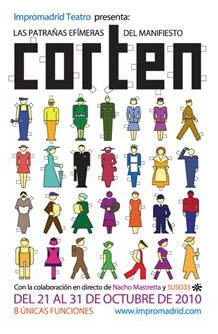 CORTEN (Las Patrañas Efímeras del Manifesto Corten) es la nueva y décima producción de Impromadrid Teatro, una propuesta en la que llevan la improvisación teatral un paso más allá junto a Nacho Mastretta (música en directo) y a SUSO33 (escenografía en progreso). El músico y compositor Nacho Mastretta y el artista urbano Suso33 participarán en la nueva producción de Impromadrid Teatro, 'Corten'.