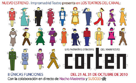 Impromadrid Teatro anuncia las colaboraciones en directo de Nacho Mastretta y de SUSO33 en su nueva producción Corten. Ambos artistas se suman así a darle una vuelta de tuerca a la improvisación teatral con Corten (Las Patrañas efímeras del Manifesto Corten). A partir del 21 de octubre, y hasta el 31 de mismo mes, los espectadores podrán participar en 8 únicas funciones en la Sala Verde de los Teatros del Canal. A partir de las sugerencias del público se crearán el texto, la escenografía y la música, de modo que cada noche nacerá un nuevo “Corten”. Tres personajes se encuentran en el escenario para crear una obra de teatro en directo, sin un texto previo. El público crea la historia a través de sugerencias que deberán aparecer en la historia creada. Del mismo modo, la historia que inventen tendrá que seguir diferentes normas y atenerse a ciertas reglas, las que constituyen el manifiesto Corten. Todo ello conforma una obra que se va creando sobre la marcha, con las mismas dosis de improvisación y de buen hacer.
