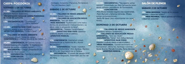POSIDONIA 2010. ART I NATURA. III Festival Internacional de Arte, Medioambiente y Desarrollo Sostenible en la isla de Formentera. POSIDONIA FESTIVAL en FORMENTERA: 1-3 de Octubre 2010 Todas las actividades y los conciertos son gratuitos POSIDONIA Off música y conciertos en vivo y acústicos - festival de cine medioambiental - cortometrajes - talleres - conferencias - eco-feria - performances y espectáculos - arte del reciclaje e instalaciones artísticas en el paisaje - ... Un Festival en Formentera que conecta Música, Ecología, Arte, Cultura y Turismo, respetando la isla y el medio ambiente. Un punto de encuentro en Formentera para iniciativas destinadas a proporcionar soluciones al desarrollo y el turismo sostenible. La tercera edición del Posidonia Festival art i natura, Festival Internacional de Arte, Medio Ambiente y Desarrollo Sostenible, tendrá lugar en Sant Francesc de Formentera del 1 al 3 de octubre 2010, en el Jardí de Ses Eres. La Posidonia oceánica, una planta submarina que contribuye a la conservación del espacio y del ecosistema mediterráneo, es la bandera y símbolo de este festival que pretende difundir una cultura de respeto y conservación de la Naturaleza. El POSIDONIA FESTIVAL 2010 cambia la primavera por el otoño, de mayo a octubre. Este año, declarado por la ONU Año Internacional de la Diversidad Biológica, el Festival Posidonia lo celebra con muchas y distintas actividades artísticas y culturales sobre temas de ecología relacionados directamente con el Mediterráneo, además de la Ecoferia, el Documental y los talleres que ya había en las ediciones anteriores. Quedan confirmadas las actuaciones musicales acústicas, y todas las actividades del festival siguen siendo gratuitas. Con el fin de asegurar que el desarrollo del festival anual siga de forma plenamente sostenible para la isla de Formentera, para esta edición del evento la Asociación Posidonia Project y el Consell de Formentera han decidido no montar el escenario principal, donde habian las actuaciones musicales más masivas. La organización del festival, con el objetivo de seguir adelante con el mensaje de atención al medio ambiente que la música sabe llevar muy bien a la gente, promueve igualmente una nueva iniciativa musical lanteriormente al Posidonia Festival, fuera de Formentera: POSIDONIA Off 2010 .