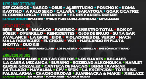 Un macro festival compuesto exclusivamente por artistas nacionales. Serán alrededor de 70 nombres los que formarán parte del cartel del evento, de los cuales en este extenso avance de cartel figuran ya 51. En Vivo contará con 4 escenarios, en los que estarán representados estilos como el rock, el metal, el punk, el hip-hop o la world music. Dentro de la rama rock destacan artistas como Fito & Fitipaldis, todo un fenómeno super ventas que está arrasando con la gira de presentación de su disco 'Antes de que cuente diez'.