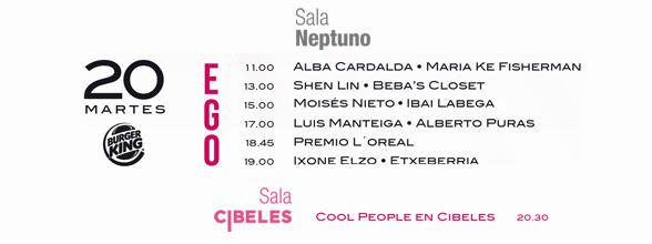 EL EGO es la plataforma de jóvenes talentos de la moda, organizada por IFEMA, que se celebra dos veces al año en el marco de CIBELES MADRID FASHION WEEK, el gran espacio de promoción de la moda española y su más destacado referente. EL EGO nació en febrero 2006, con el fin de dar a conocer nuevos diseñadores que entendieran la moda como una forma de expresión, como una disciplina artística que forma parte de la cultura de su tiempo, con la justificación final de llegar a la calle, ser aceptada por la sociedad y continuar así el camino de la evolución descubriendo nuevos estilos, tendencias innovadoras….En definitiva, un espacio donde reunir y mostrar propuestas alternativas que dejen de serlo una vez asumidas por todos para seguir, a partir de ese momento, investigando y ofreciendo nuevos diseños a un mundo cada vez más vertiginoso.