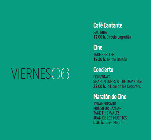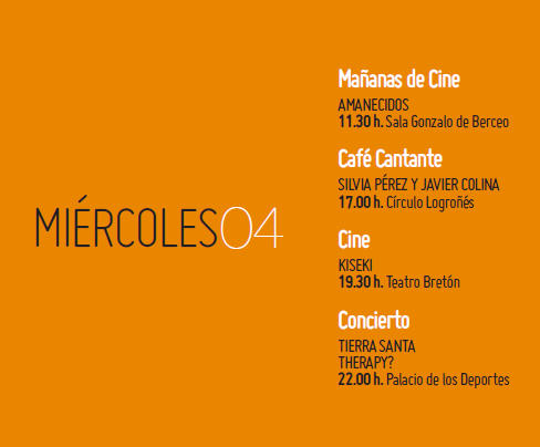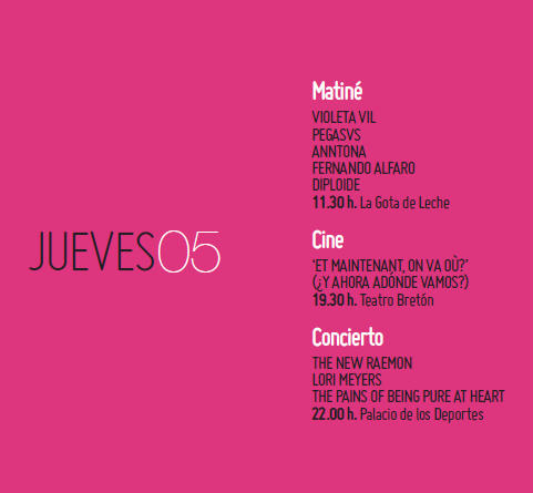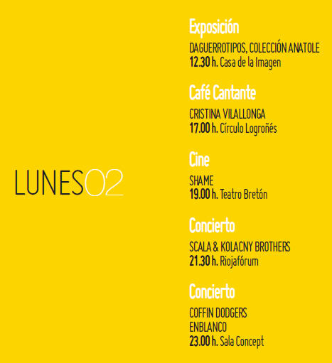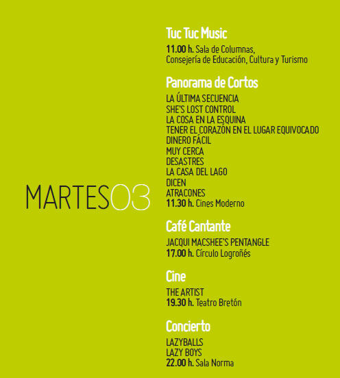 de Educación, Cultura y Turismo. Se celebrará en Logroño la primera semana natural del año, del 2 al 8 de enero de 2012, y contará, entre otros, con la presencia de `Los Enemigos´, que iniciarán su esperada gira de regreso tras diez años; `Loquillo´, con un concierto más intimista y poético; `Tierra Santa´, la banda riojana de heavy metal, o los neoyorkinos `The Pains of Being Pure at Heart´ y su melódico pop independiente. |