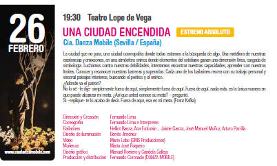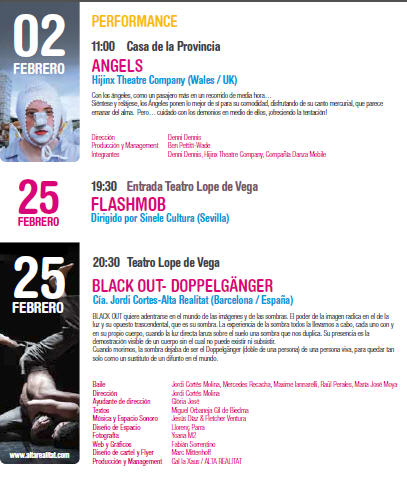 OBJETIVOS: »Hace seis años el Teatro Lope de Vega y la Compañía Danza Mobile dieron forma a un proyecto que consistía en la creación de un Festival de las artes integradas en Sevilla. Pero no podía ser un festival al uso, sino uno en el que se dieran cita los artistas y compañías más relevantes del panorama internacional. Artistas y producciones que, por sus características, no solían tener cabida en los circuitos habituales de las artes escénicas –aunque eso ya está cambiando–. El VI Festival Escena Mobile supone la consolidación de aquel proyecto. Y hoy podemos afirmar que el Festival es uno de los mejores escaparates tanto en España como a nivel europeo en cuanto a la difusión de relevantes espectáculos de primer nivel.