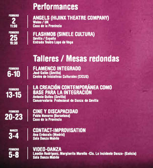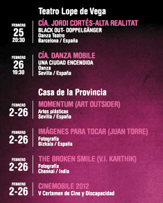 | La VI edición del Festival Internacional Escenamobile de Sevilla sobre Arte y Discapacidad tendrá lugar los próximos meses de febrero y marzo de 2012. Está constituido por una programación escénica que tiene lugar en el Teatro Lope de Vega de Sevilla los días 25-26 de Febrero de 2012, y una programación paralela formada por exposiciones de artes plásticas, talleres, mesas redondas, además de la participación de artistas invitados. | ||