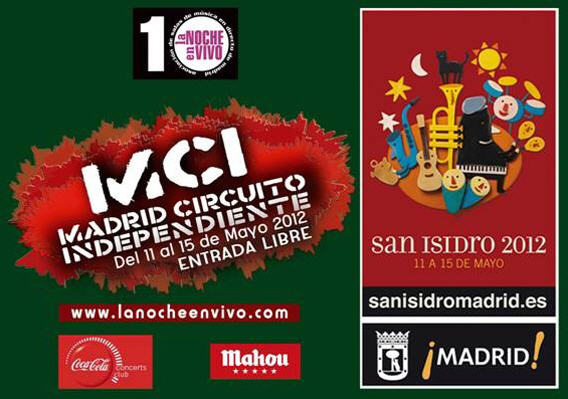 Resumiendo: Pregón y Gigantes y Cabezudos: 11 de mayo a las 18:00 en la plaza de la Villa para abrir las fiestas. Después habrá un concierto de zarzuela y música popular, homenaje al maestro Alonso, en la Plaza Mayor (21:30). Ciro Callejeando: El circo estará representado por el ciclo Callejeando, que inundará las calles y plazas de Lavapiés con varios días de programación de teatro musical e intervenciones urbanas. Chotis: 12 de mayo en Las Vistillas, donde se celebrará un original certamen, bajo el título Tú sí que chotis. Madrid Circuito Independiente: Conciertos en distintas salas de la Noche en Vivo. La Noche en Vivo (Asociación de Salas de Música en Directo de Madrid) presenta la sexta edición de Madrid Circuito Independiente. Conciertos de Sex Museum, Gran Wyoming y los Insolventes, Cosmosoul, Dragonfly, The Fire Eaters, Juanita y los Feos. La Noche En Vivo de nuevo promueve este emocionante proyecto en el que grupos y artistas, los sellos discográficos que editan y promocionan su música y las salas de conciertos que los programan en vivo, se complementan perfectamente a la hora de exhibir cuál es la situación del panorama musical del momento en el ámbito creativo. En MCI 2012 serán seis sellos discográficos independientes, alternados con el nuevo fenómeno que invade la edición de discos: la autoedición, para que la música grabada encuentre caminos de supervivencia fuera de esquemas clásicos y ya caducos: los de las multinacionales del disco. MCI tendrá lugar entre los días 11 y 15 de mayo en 11 conciertos apasionantes para todos aquellos a los que les apasiona la buena música.