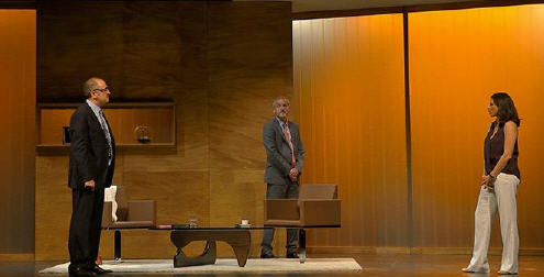 Comentario: Una nueva obra teatral con la corrupción, la política y la manipulación en el punto de mira, en este caso resalta el planteamiento y el interesante desarrollo que va mejorando a medida que transcurre la obra. Un Thriller escrito y dirigido por Pere Riera (Barcelona, 1974) que coloca cara a cara a la política y el periodismo. Con un tratamiento muy visual, como si estuvieras inmerso en una serie de televisión americana sobre el trasfondo de poder, pero en nuestra propia casa. Se nos muestra una escenografía limpia, una sala que sirve a la vez de sala de reuniones y plató de televisión. Sencilla pero suficiente, con ese punto de diseño y frialdad que muchos despachos nos muestran. Joaquín Climent, Alicia Borrachero y Jordi Rebellón conforman el triángulo protagonista, un presidente de gobierno con un oscuro secreto, una periodista en la cima de su carrera y un secretario de presidencia con pocos escrúpulos forman una trama donde nada es tan claro, ni tan oscuro, tan como comenta el propio Pere Riera trata de ‘lo intransigentes que somos juzgando los errores morales ajenos, mientras restamos importancia a los nuestros’, pero hay bastante más. El trabajo actoral es excelente, resaltando a Alicia Borrachero que después de pasar por diversas series de televisión, demuestra su dominio de la escena. Los personajes son creíbles y consiguen transmitir perfectamente cada una de las diferentes personalidades y emociones. Al principio de la obra, todo parece conocido y previsible pero a medida que avanza, el juego del poder y la manipulación lo envuelven todo, para hacernos pensar sobre nuestros actos, el poder, la honestidad, la traición a otros y a nosotros mismos, etc. Aunque al final se espera más contundencia, el resultado no deja indiferente a nadie, incluso la sensación de acidez en la boca, de asco, de injusticia, etc., puedo no ser una sensación agradable, pero es una reacción, que te invita a pensar y a identificar los sucesos cotidianos. Y aunque es indudable que la realidad supera la ficción, ‘Desclasificado’ aporta un interesante planteamiento y un excelente trabajo actoral.
